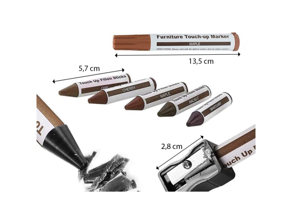 Sada slouží k jednoduchému a rychlému opravení poškozených hran, škrábanců a barevných nesrovnalostí na dřevěných a laminátových površích. Díky bohatému výběru odstínů zvládnete opravit jak světlé, tak tmavé dekory.