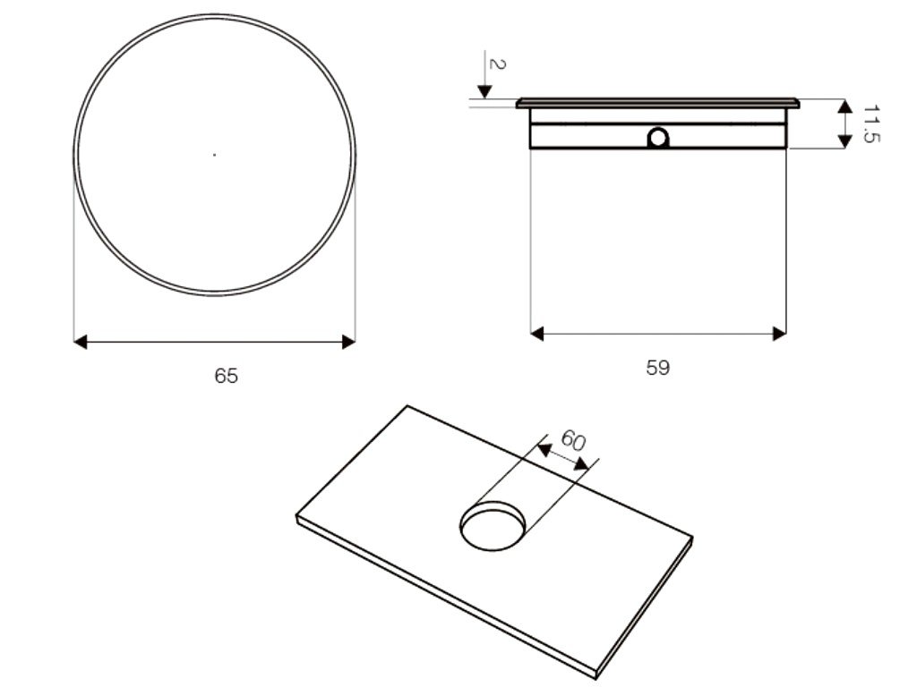 Nabíječka je určená do otvoru 60 mm a obsahuje ze spodní strany oboustrannou lepicí pásku pro jednoduchou montáž. Vnější rozměr je 65 mm a tloušťka horní části pouze 2 mm.