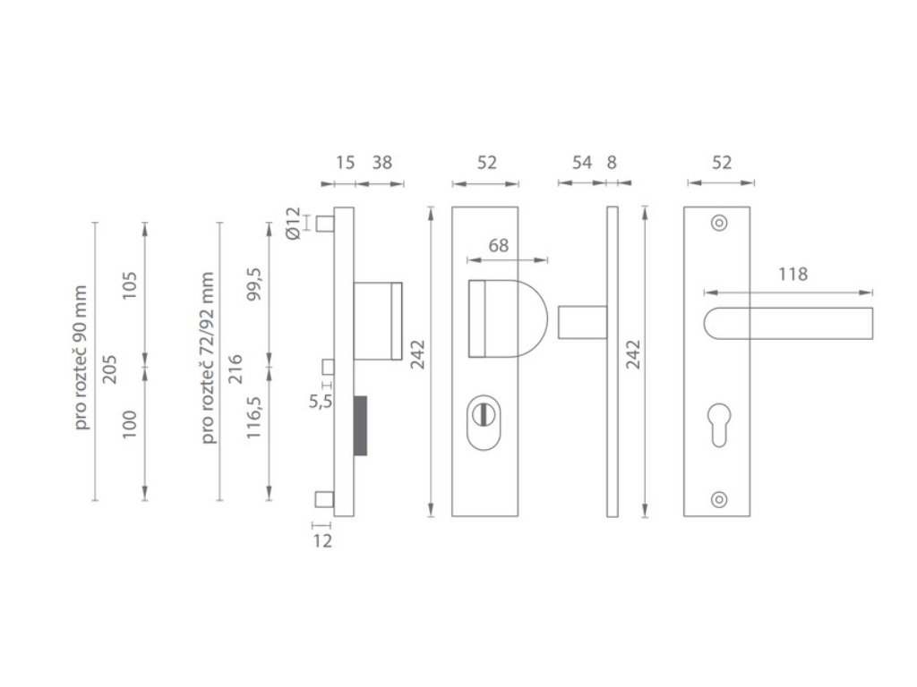 U bezpečnostního kování je zapotřebí vědět vzdálenost mezi osou kliky a osou klíče (rozteč). Kování s roztečí 92 mm je standardem pro tloušťku dveří od 68 mm do 78 mm!