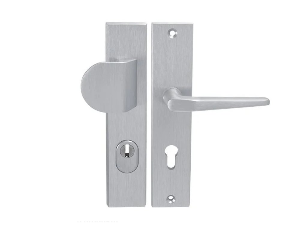 Štítová dveřní klika s bezpečnostním hranatým štítem s překrytím cylindrické vložky. Je určená na vchodové a bezpečnostní dveře. Vyrobena z materiálu hliník.