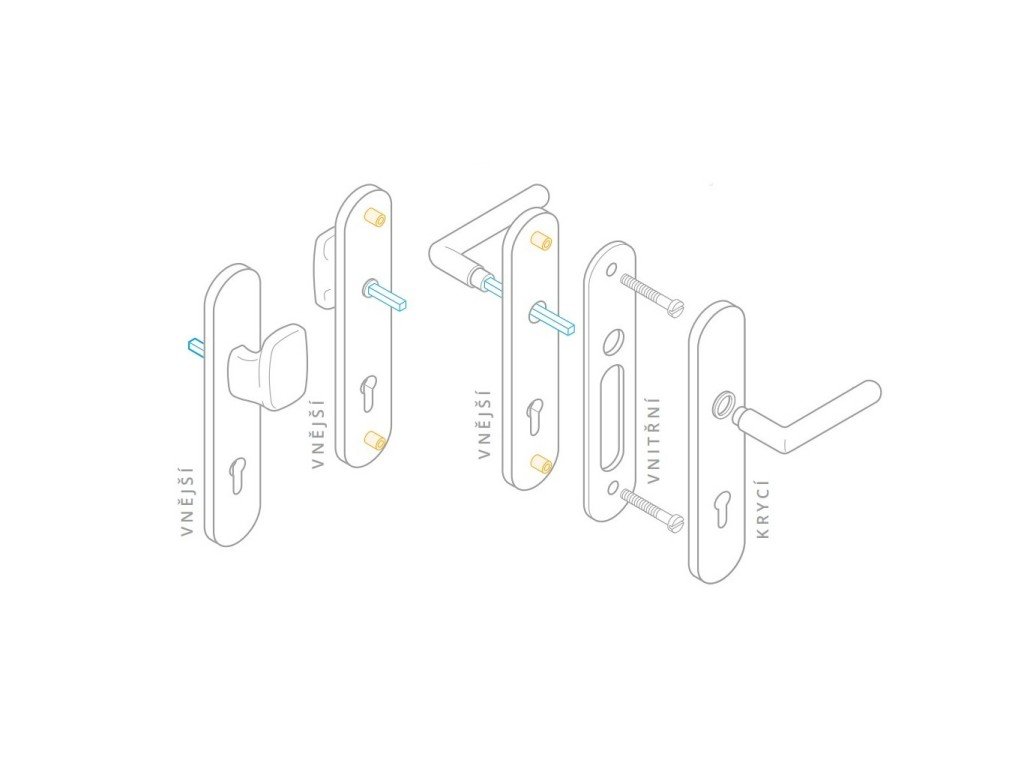 Bezpečnostní kování je dostupné v těchto provedeních klíčů, tedy PZ a varianta klika/koule.