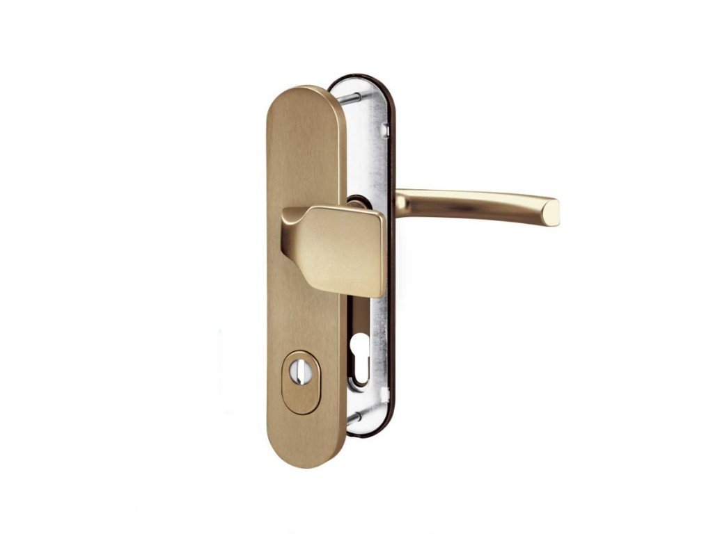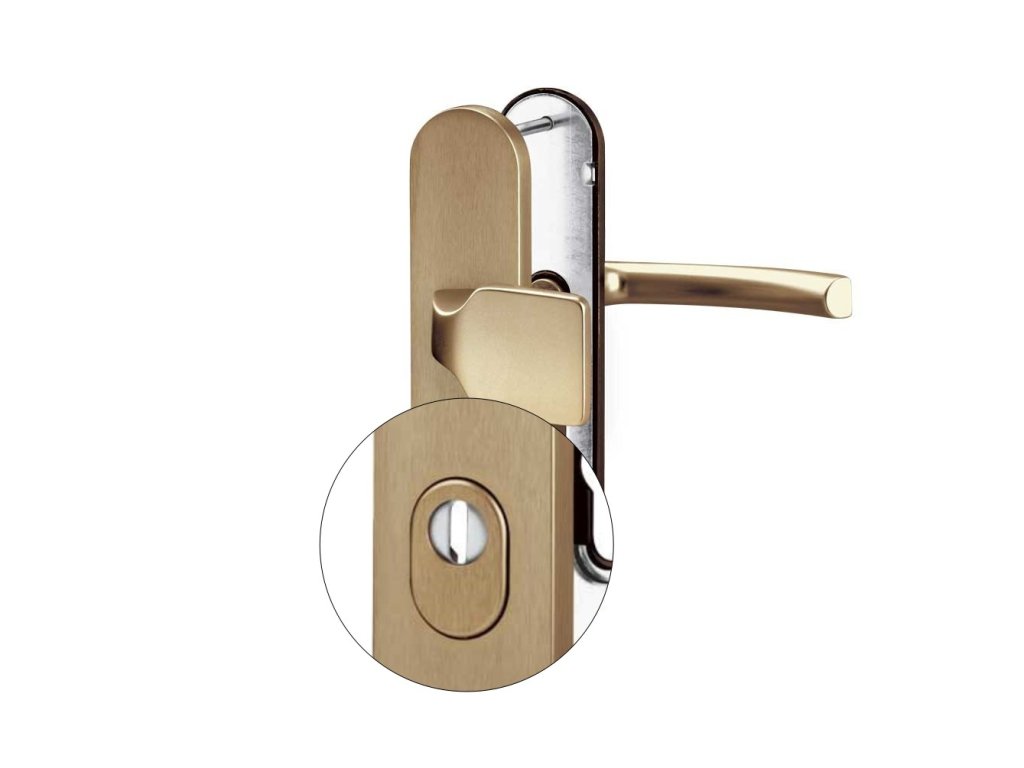 Bezpečnostní dveřní klika pro vstupní vchodové dveře - štítové oválné kování. Certifikováno v bezpečnostní třídě RC3 (podle ČSN ENV 1627 : 2012).