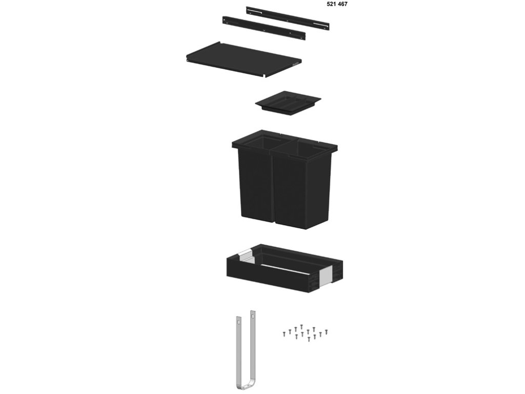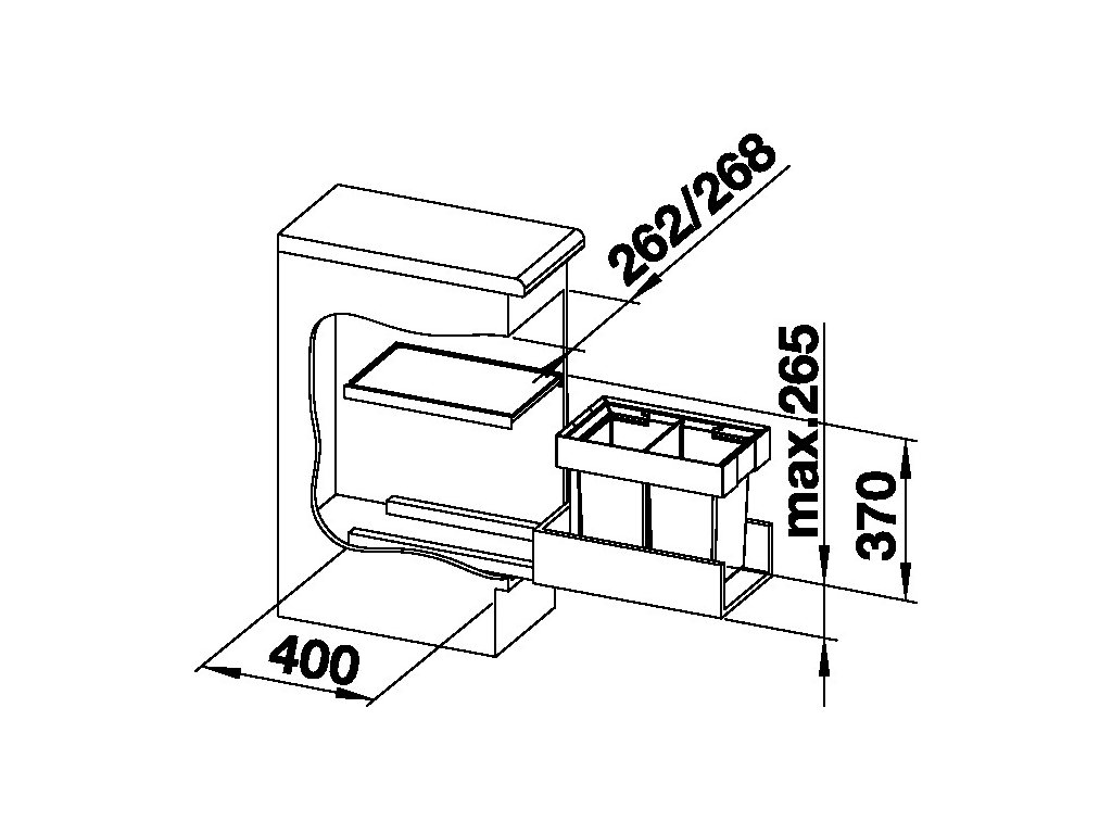 Koš je určen pro vnější šířku skříňky 30 cm. Minimální potřebný prostor ve skříňce je: výška 360 mm (330 bez horního krytu) a hloubka 400 mm.
