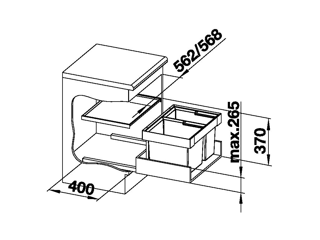 Koš je určen pro vnější šířku skříňky 60 cm. Minimální potřebný prostor ve skříňce je: výška 360 mm (330 bez horního krytu) a hloubka 400 mm.