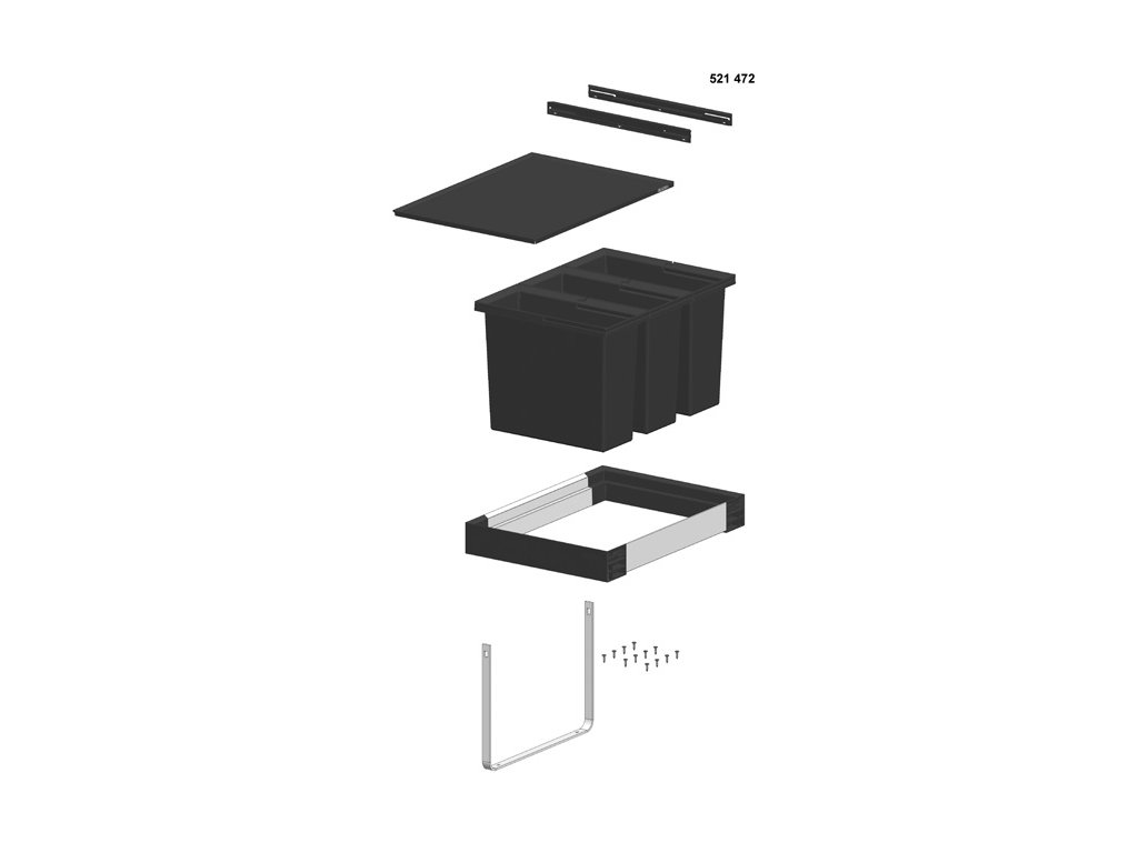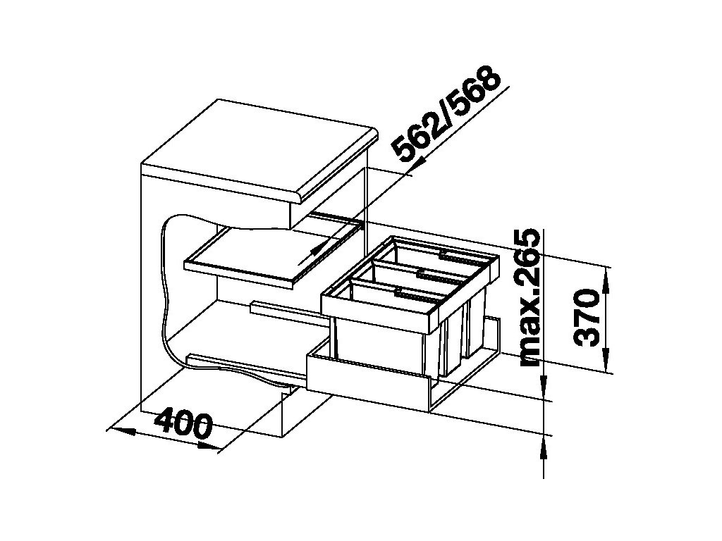 Koš je určen pro vnější šířku skříňky 60 cm. Minimální potřebný prostor ve skříňce je: výška 360 mm (330 bez horního krytu) a hloubka 400 mm.