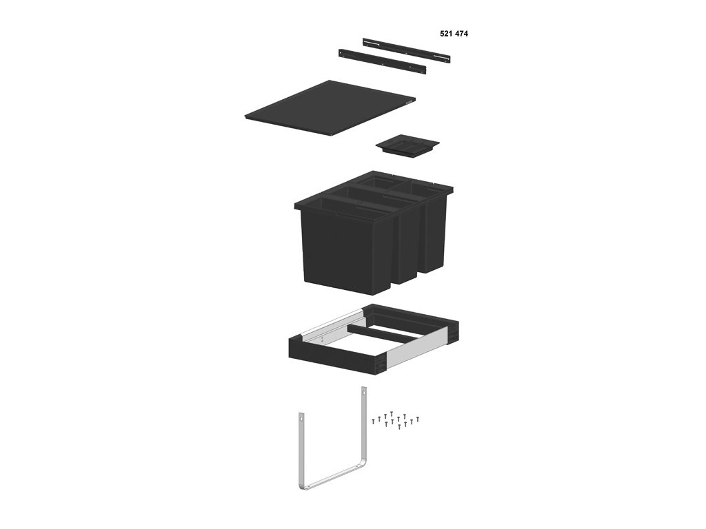 Koš je určen pro vnější šířku skříňky 60 cm. Minimální potřebný prostor ve skříňce je: výška 360 mm (330 bez horního krytu) a hloubka 400 mm.