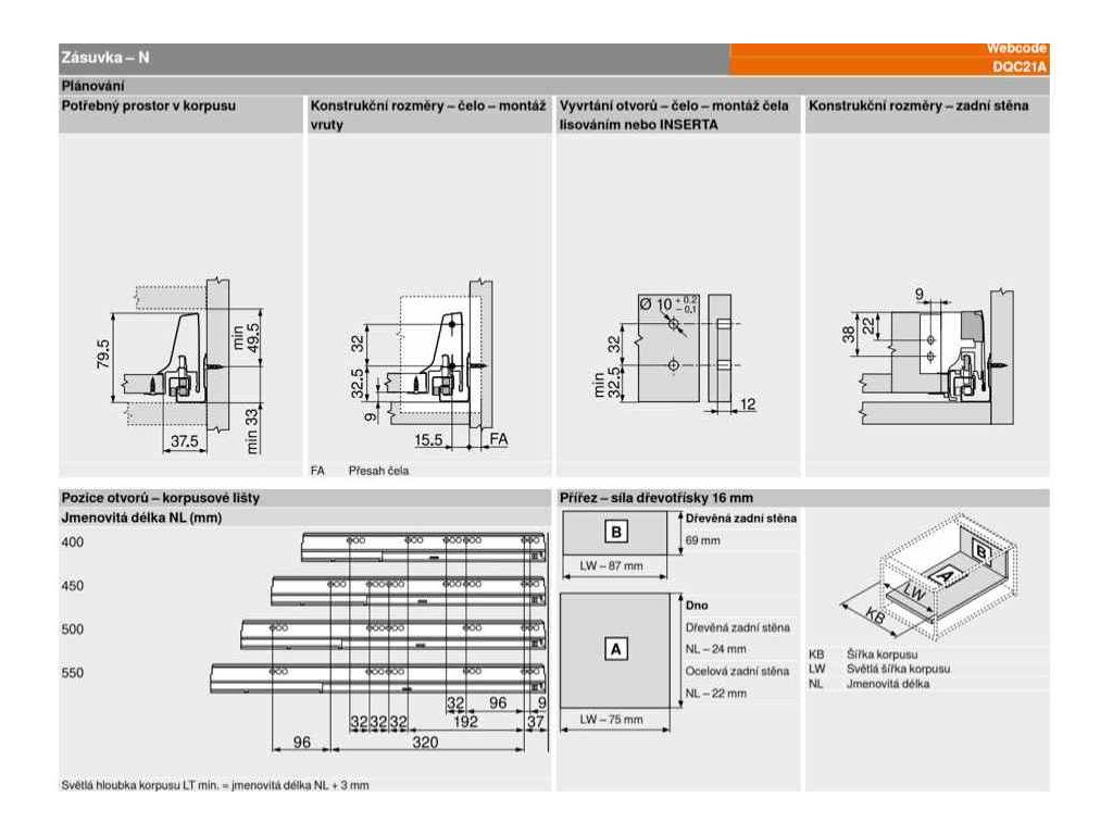 Výsuvy - jmenovitá délka: | 400 mm, 450 mm, 500 mm, 550 mm |