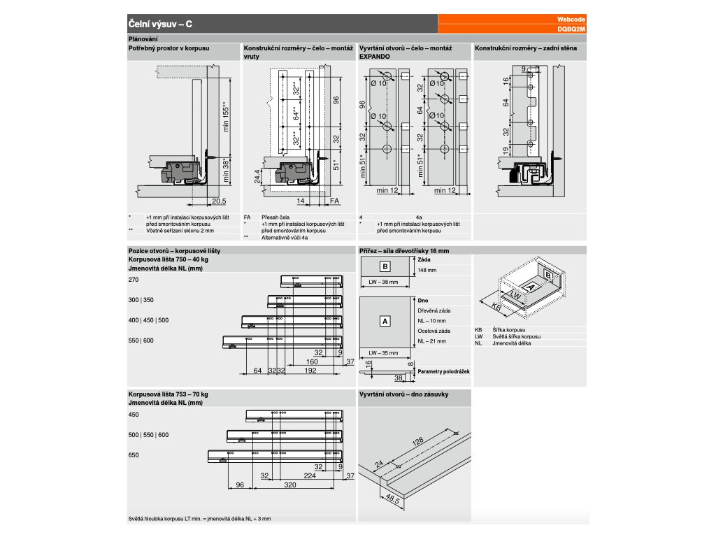 Výsuvy - jmenovitá délka: | 270 mm, 300 mm, 350 mm, 400 mm, 450 mm, 500 mm, 550 mm, 600 mm, 650 mm |