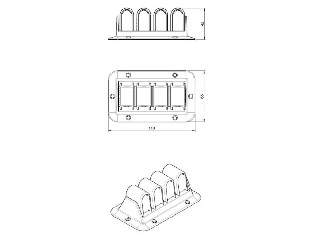 Plastový držák pro vedení kabelů pod stolem, trendy černá povrchová úprava. Čtyři plastové svěrky pro umístění kabelů. Jednoduchá instalace na spodní část pracovní desky.