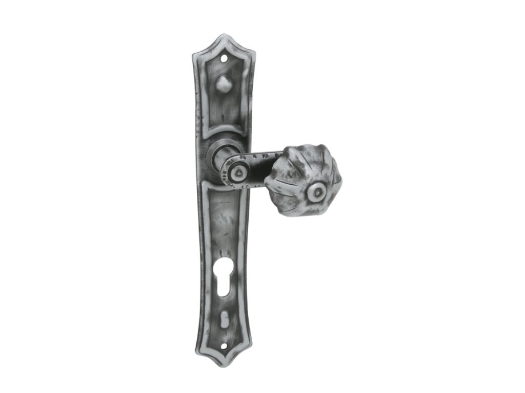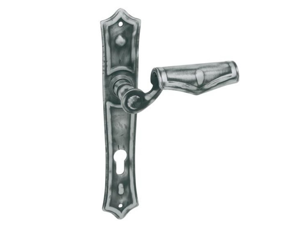 Retro štítová dveřní klika s kovaným štítem, která především vyniká svým tvarem a šedou povrchovou úpravou. Je vyrobena z kovaného železa.