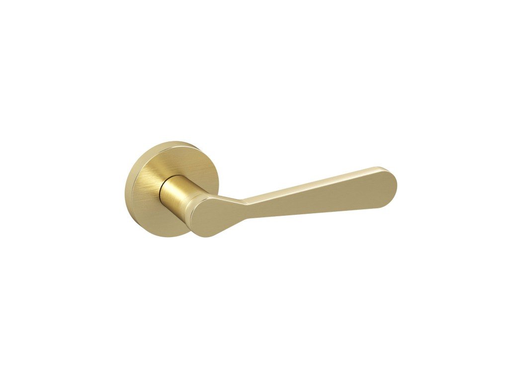 Elegantní a moderní dveřní klika. Vyniká především svým tvarem a matnou zlatou povrchovou úpravou.
