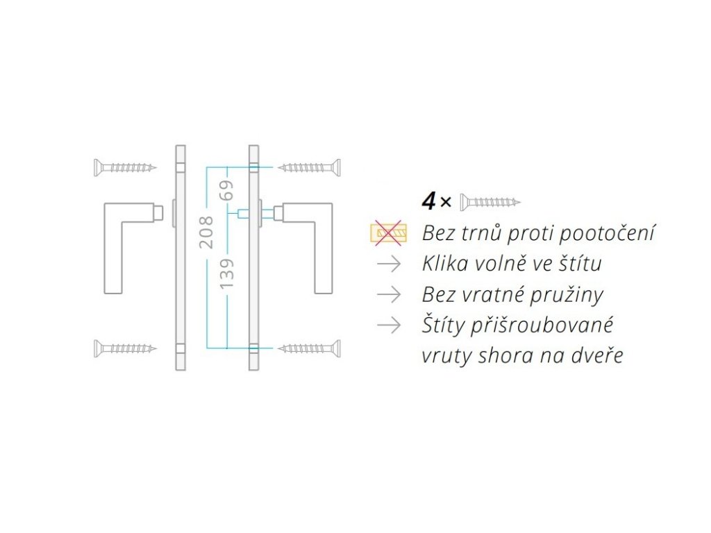Klika je volně ve štítu bez vratné pružiny. Bez trnů proti pootočení.
