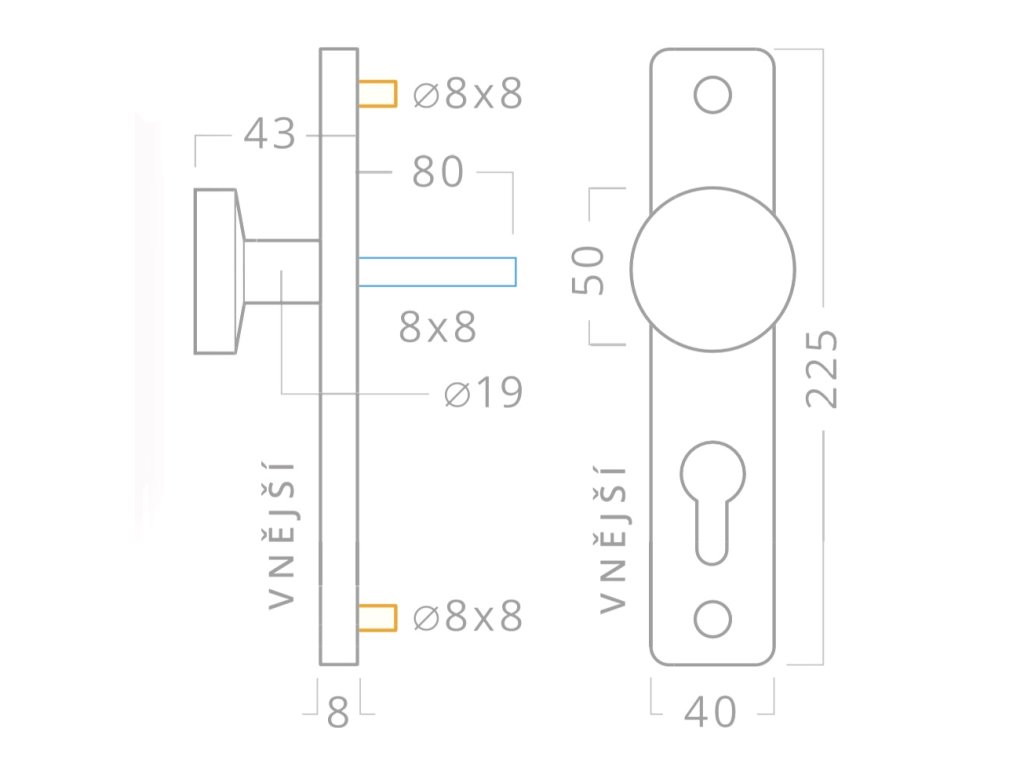 | Dveřní kliky - tvar rozety/štítu: | Hranatý štít |