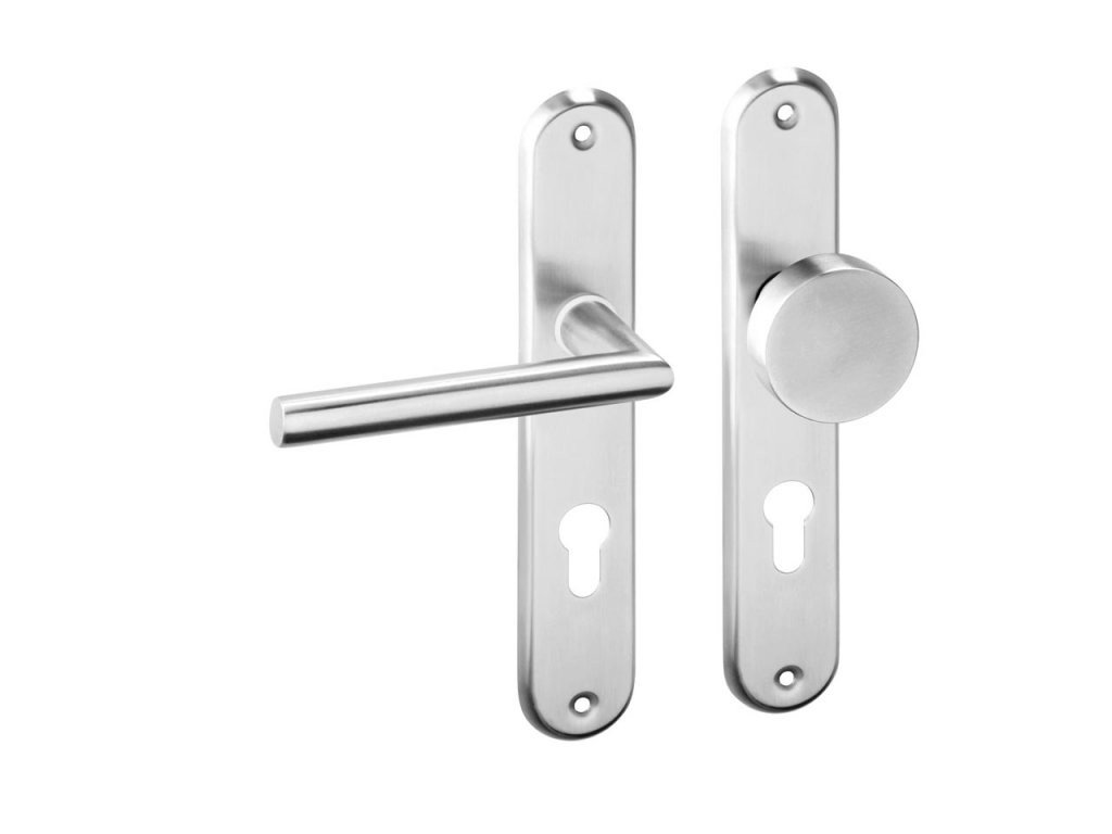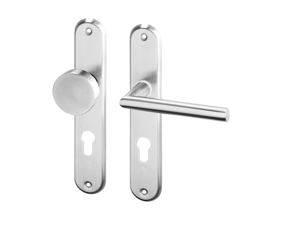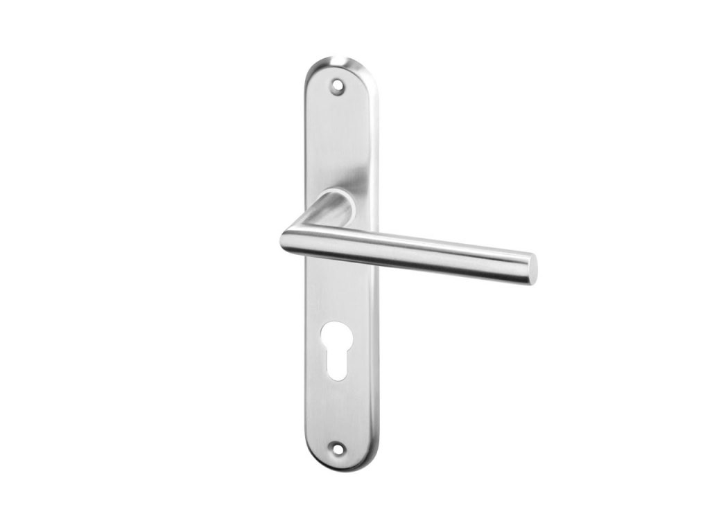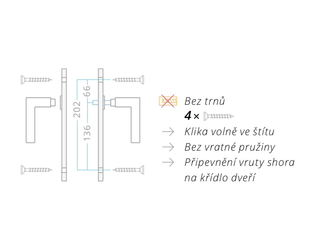 Moderní dveřní kování do interiéru - štítková klika oválná na dveře, materiál kliky je nerez AISI 304 s nerezovou povrchovou úpravou. Klika je volně ve štítu bez vratné pružiny. Robustní litá konstrukce štítu bez trnů proti pootočení. Bez vratné pružiny. Připevněno vruty shora na křídlo dveří. Rozteč o velikosti 90 mm.