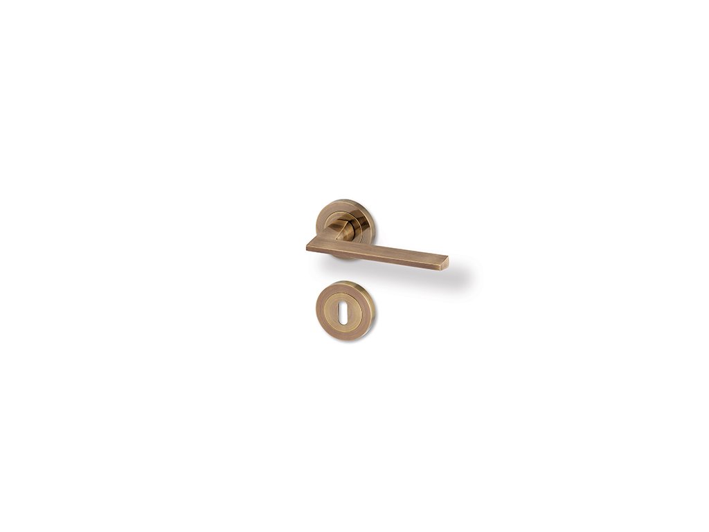 Bronzové dveřní kování do interiéru - rozetová klika na dveře, materiál kliky je kombinace zinkového a hliníkového odlitku s bronzovou povrchovou úpravou. Klika je spojena s rozetou. Robustní litá konstrukce rozety bez trnů proti pootočení.