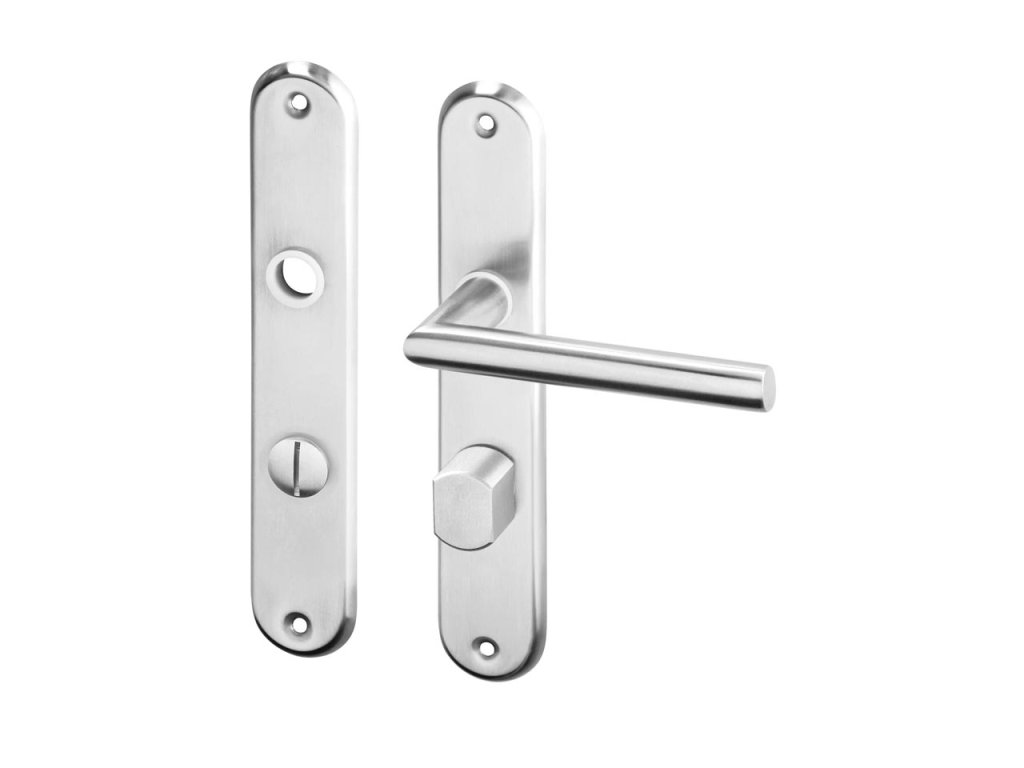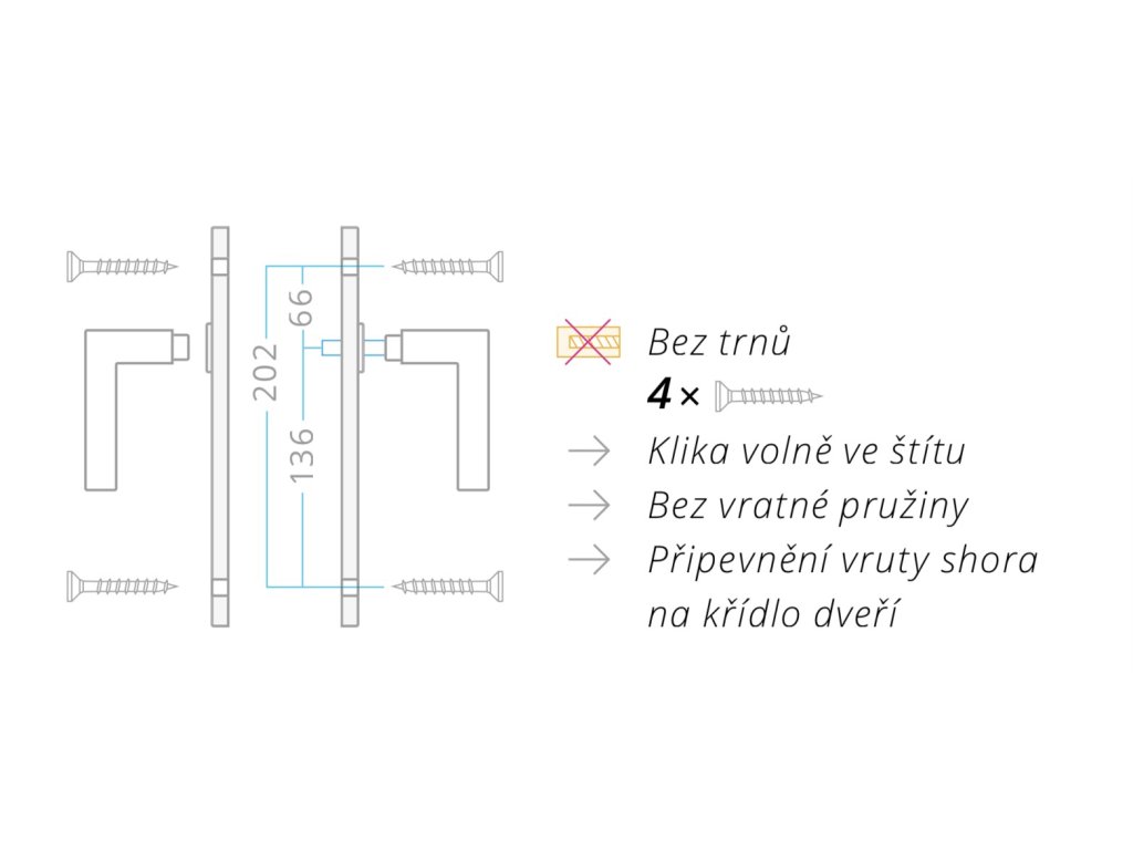 Moderní dveřní kování do interiéru - štítková klika oválná na dveře, materiál kliky je nerez AISI 304 s nerezovou povrchovou úpravou. Klika je volně ve štítu bez vratné pružiny. Robustní litá konstrukce štítu bez trnů proti pootočení. Připevněno vruty shora na křídlo dveří. Rozteč o velikosti 90 mm.