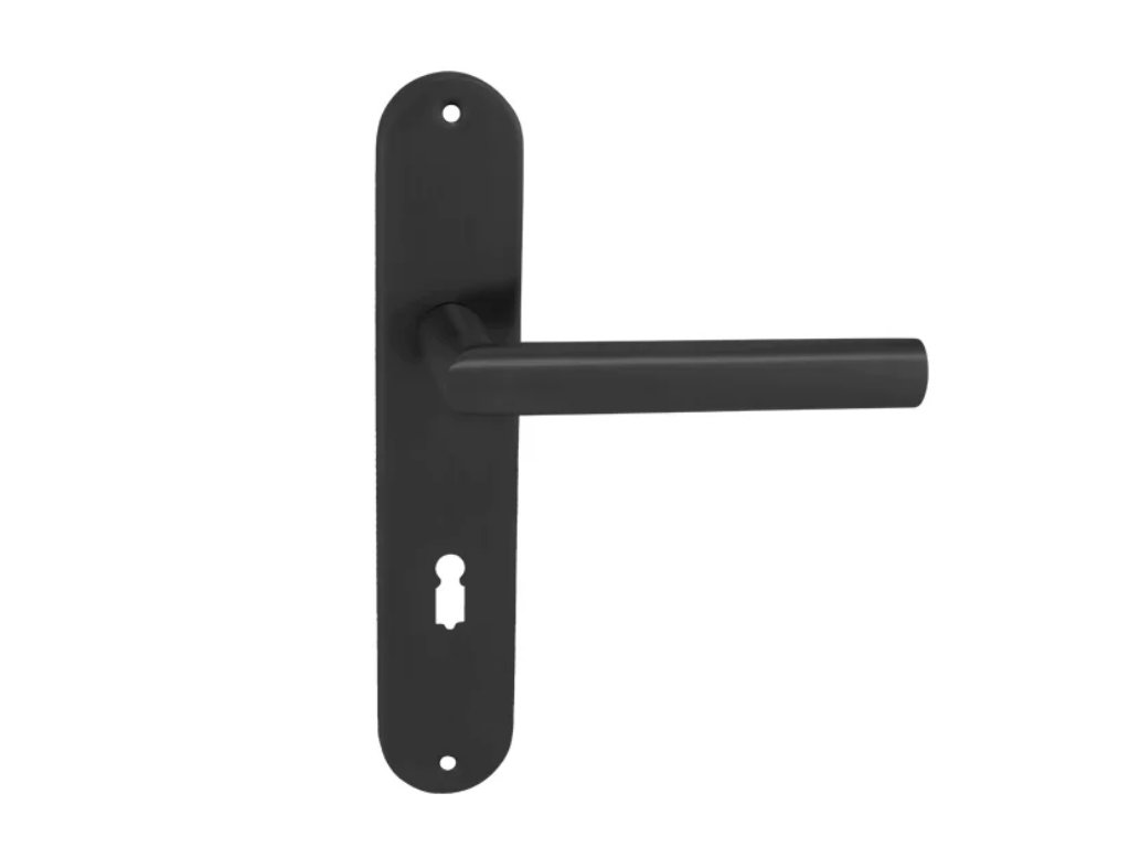 Štítová dveřní klika s oválným štítem. Vyniká především svým tvarem, odolností a černou matnou povrchovou úpravou.
