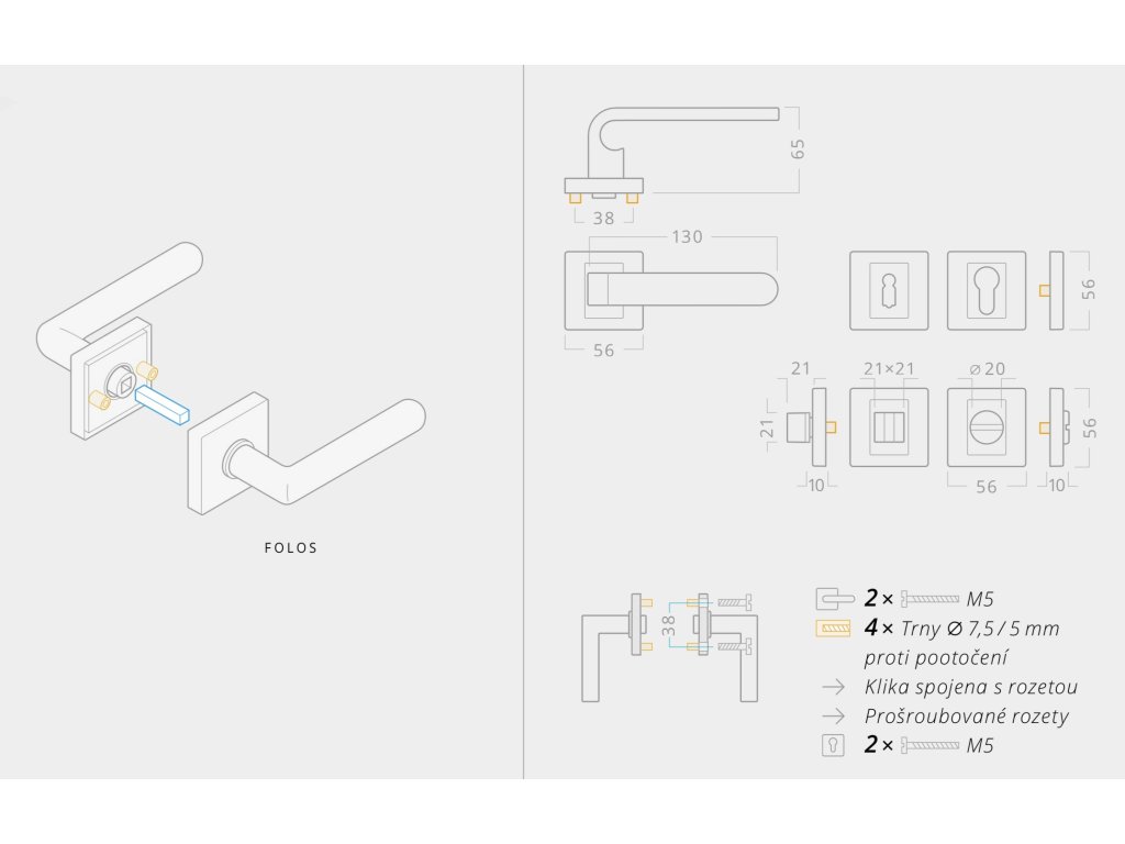 | Dveřní kliky - tvar rozety/štítu: | Hranatá rozeta |