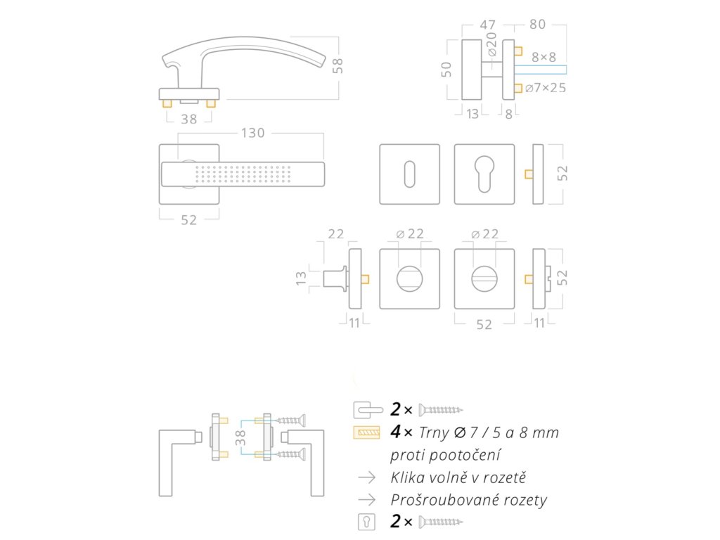 | Dveřní kliky - tvar rozety/štítu: | Hranatá rozeta |