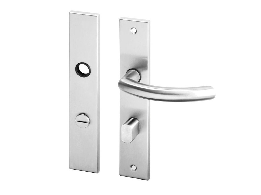 Moderní dveřní kování do interiéru - štítková klika hranatá na dveře, materiál kliky je nerez AISI 304 s kvalitní nerezovou povrchovou úpravou. Rozteč 72 mm.