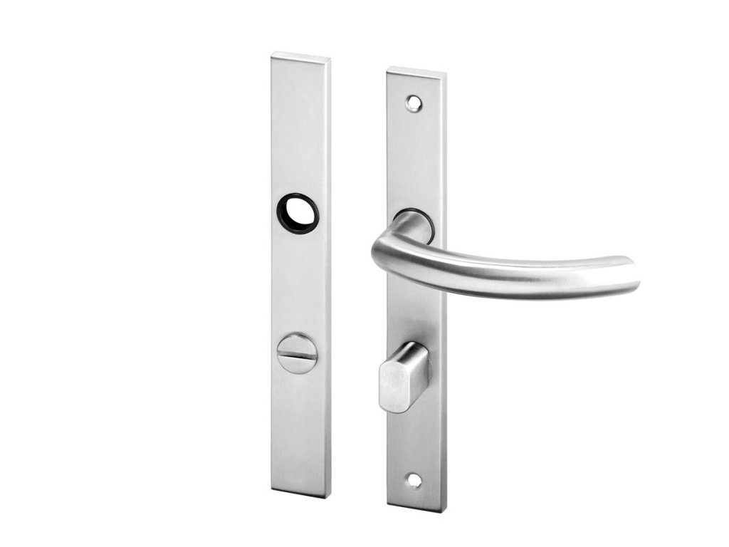 Moderní dveřní kování do interiéru - úzká štítková klika hranatá na dveře, materiál kliky je nerez AISI 304 s kvalitní nerezovou povrchovou úpravou. Rozteč 72 mm.