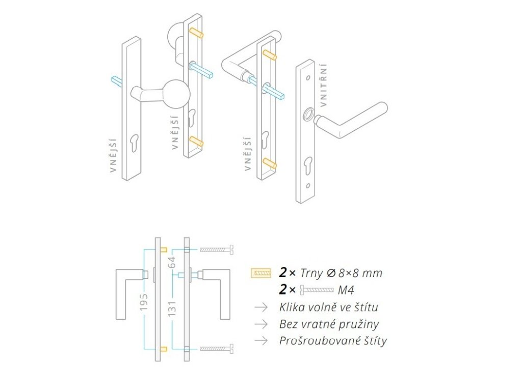 Klika je volně ve štítu bez vratné pružiny. Připevnění vruty shora na křídlo dveří.