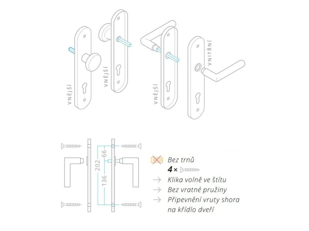 Klika je volně ve štítu bez vratné pružiny. Štíty jsou prošroubované skrz dveře.