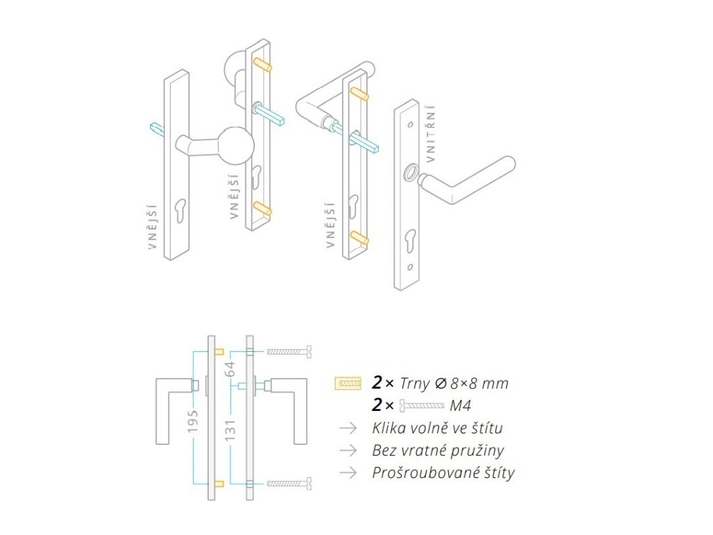 Klika je volně ve štítu bez vratné pružiny. Štíty jsou prošroubované skrz dveře.