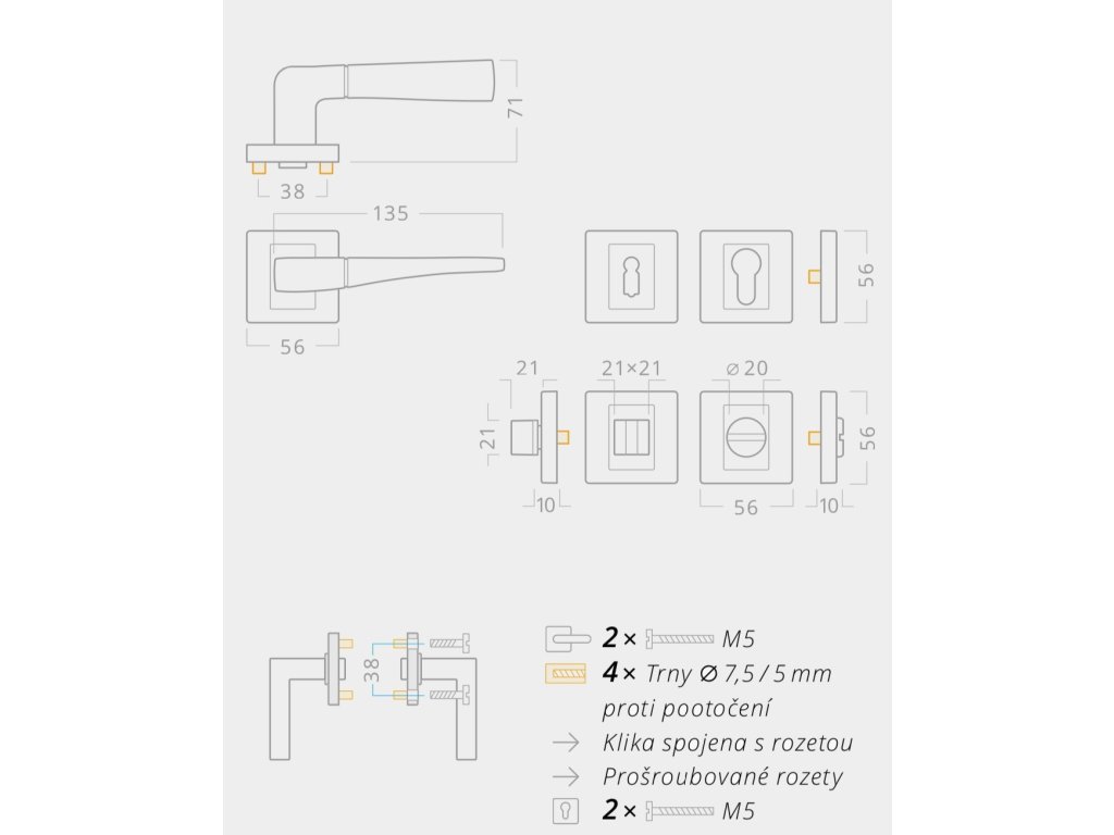 | Dveřní kliky - tvar rozety/štítu: | Hranatá rozeta |