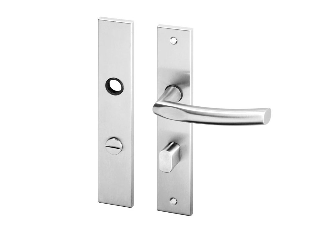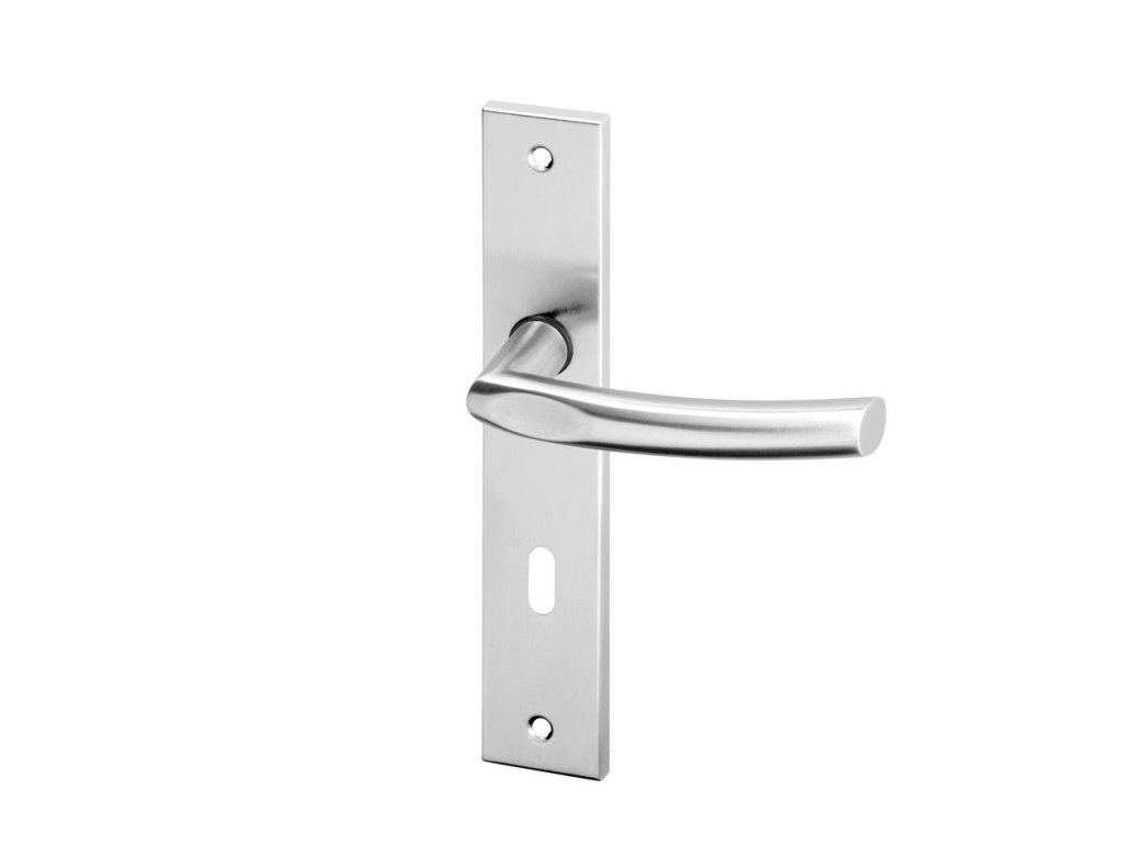 Moderní dveřní kování do interiéru - štítková klika hranatá na dveře, materiál kliky je nerez AISI 304 s kvalitní nerezovou povrchovou úpravou. Rozteč 90 mm.