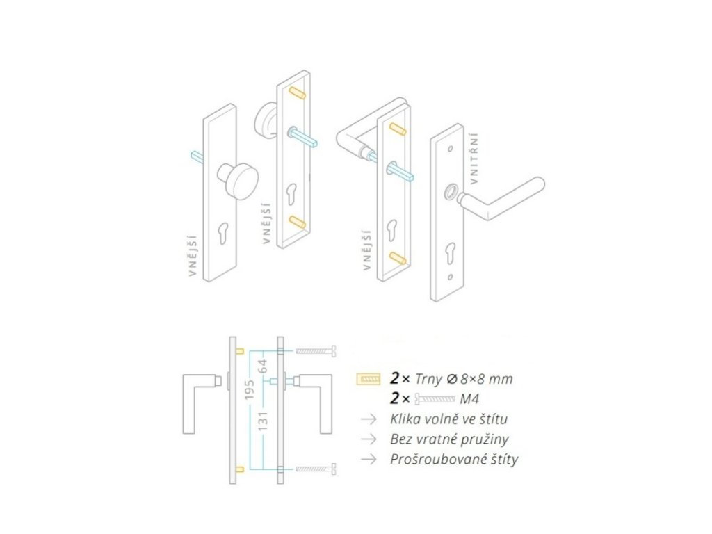 Klika je volně ve štítu bez vratné pružiny. Štíty jsou prošroubované skrz dveře.