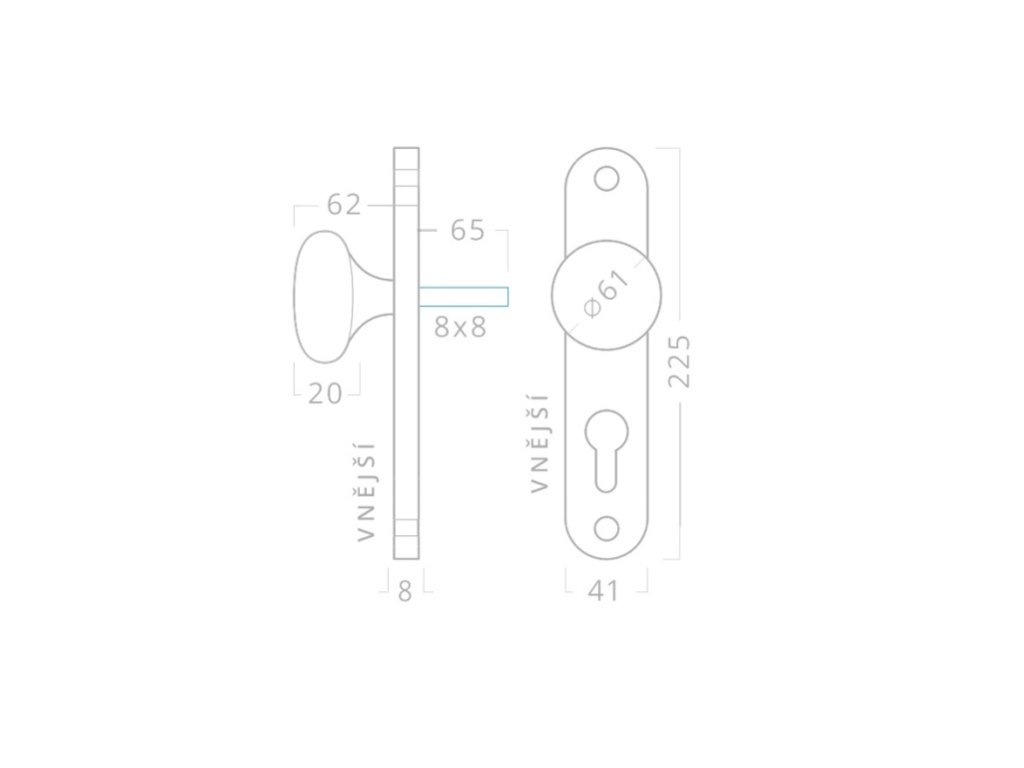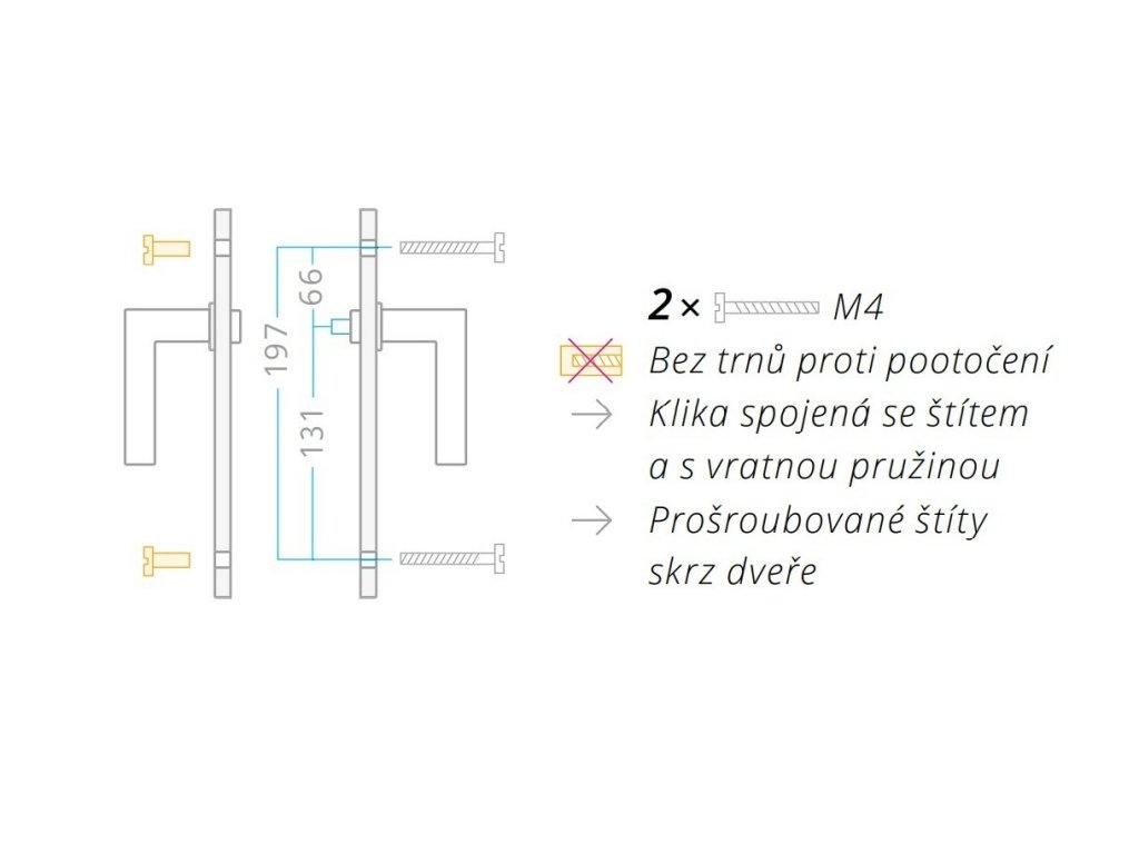 Klika je spojená se štítem a s vratnou pružinou. Bez trnů proti pootočení. Štíty jsou prošroubované skrz dveře.