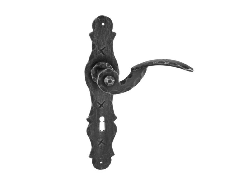 Retro štítová dveřní klika s kovaným štítem, která především vyniká svým tvarem a šedočernou povrchovou úpravou. Je vyrobena z kovaného železa.