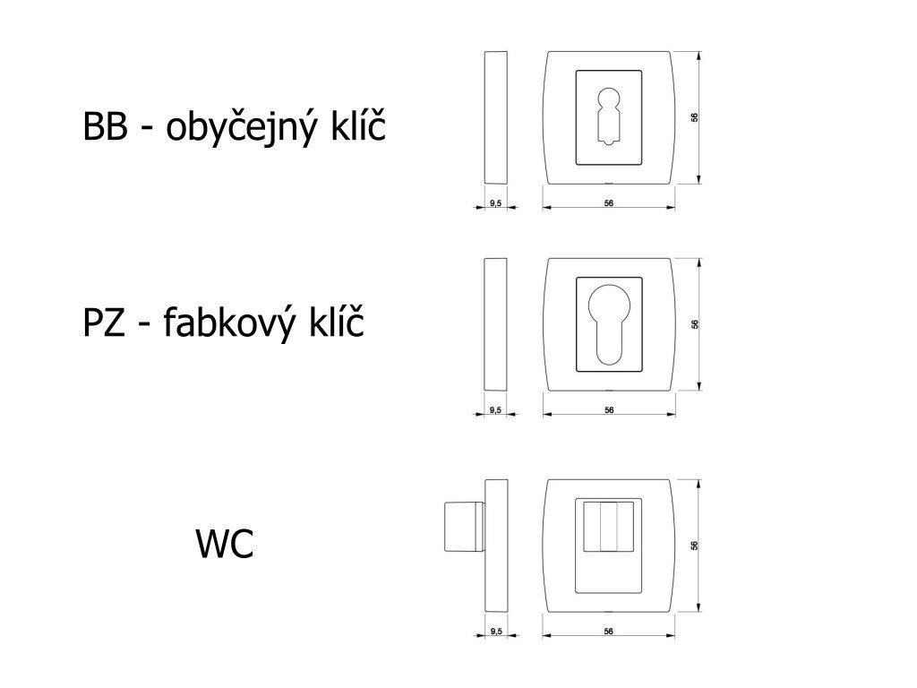 | Dveřní kliky - tvar rozety/štítu: | Hranatá rozeta |
