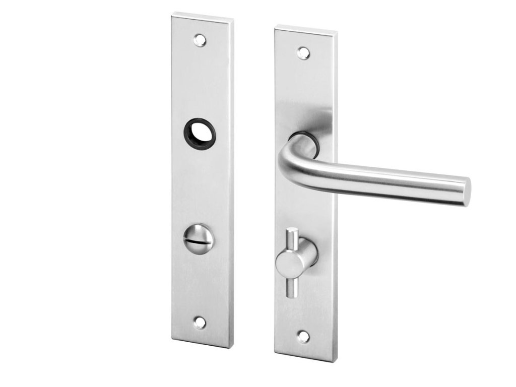 Klasické dveřní kování do interiéru - štítková klika hranatá s vratnou pružinou na dveře, materiál kliky je nerez AISI 304 s kvalitní nerezovou povrchovou úpravou. Rozteč 72 mm.