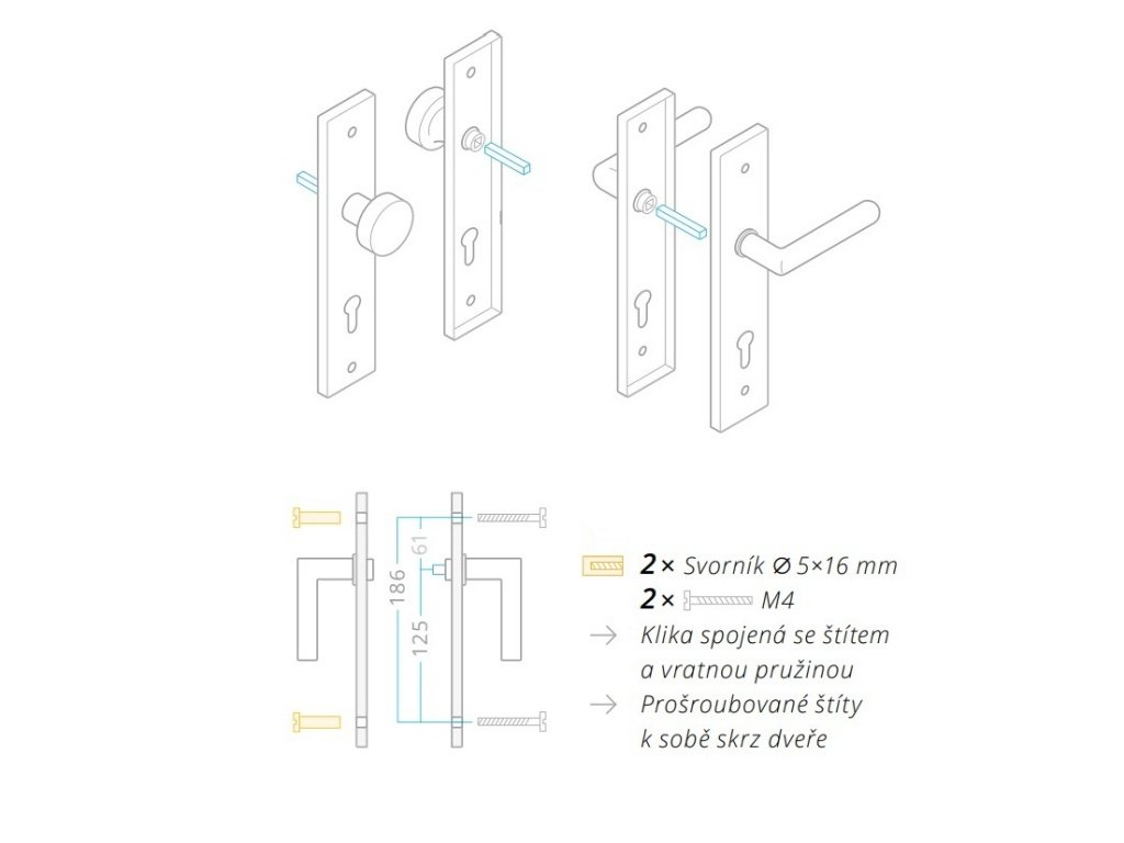 Klika je spojena se štítem a vratnou pružinou. Štíty jsou prošroubované k sobě skrz dveře.