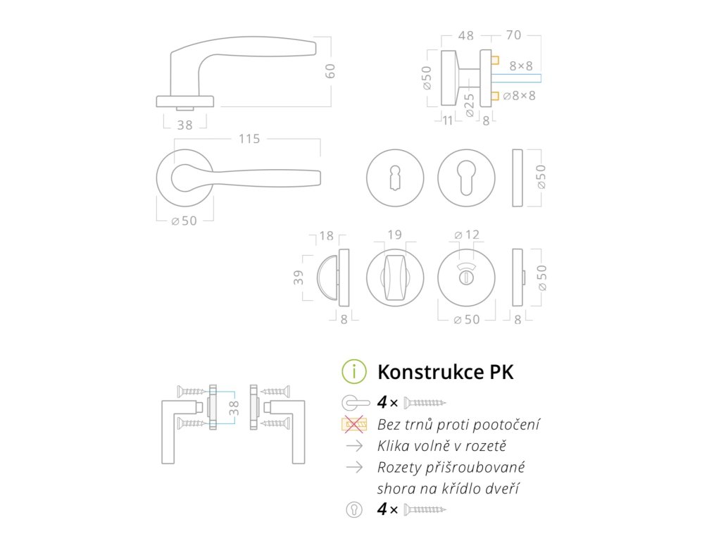 Dveřní kování je dostupné ve všech provedeních klíčů tedy PZ, BB, WC varianta a navíc i varianta klika/koule.