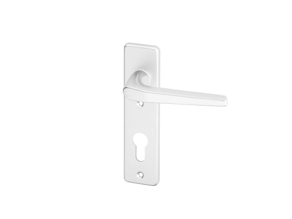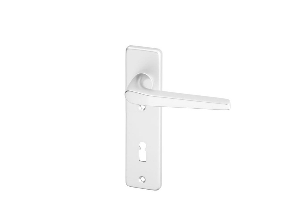 Klasické dveřní kování do interiéru - štítková klika hranatá krátká na dveře s jednoduchým designem.