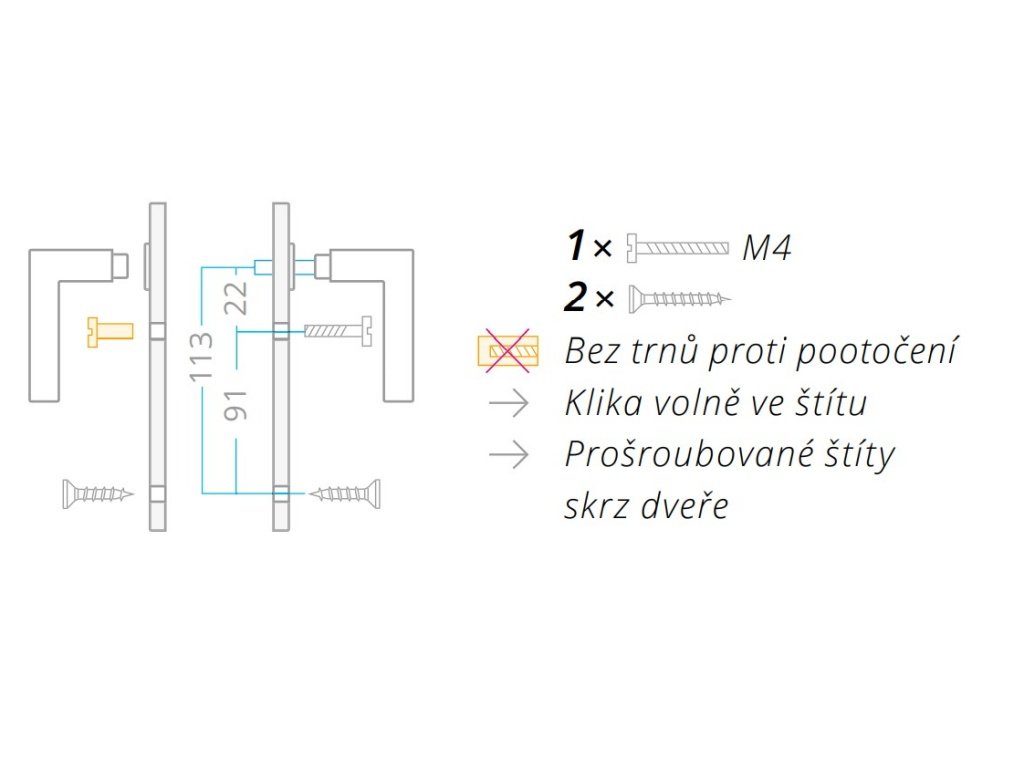Klika je volně ve štítu bez vratné pružiny. Bez trnů proti pootočení. Štíty jsou prošroubované k sobě skrz dveře.