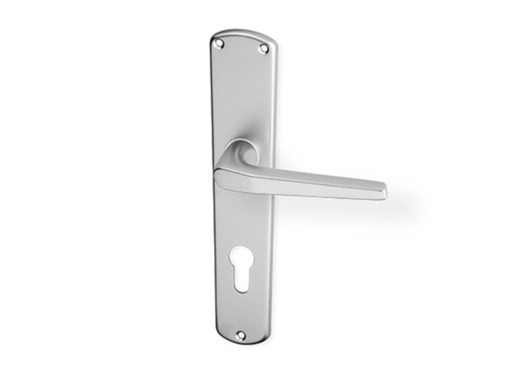 Klasické dveřní kování do interiéru - štítková klika hranatá na dveře s jednoduchým designem. Klika má zaoblené rohy.