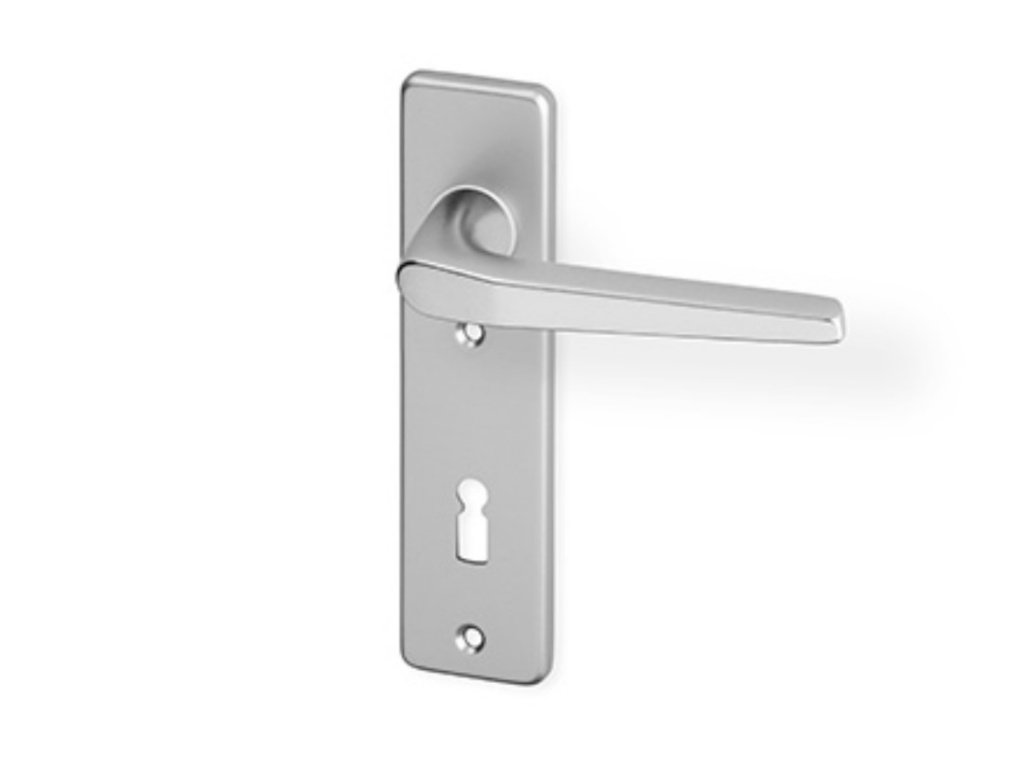 Klasické dveřní kování do interiéru - štítková klika hranatá krátká na dveře s jednoduchým designem.