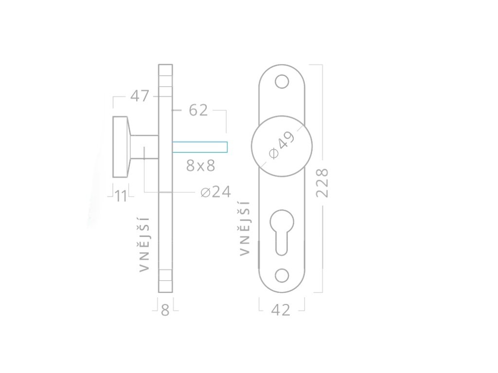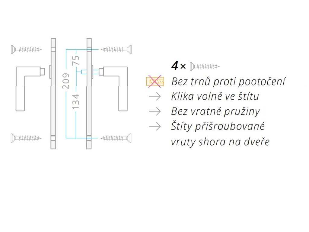Klika je volně ve štítu bez vratné pružiny. Bez trnů proti pootočení. Štíty jsou přišroubovány vruty shora na dveře.