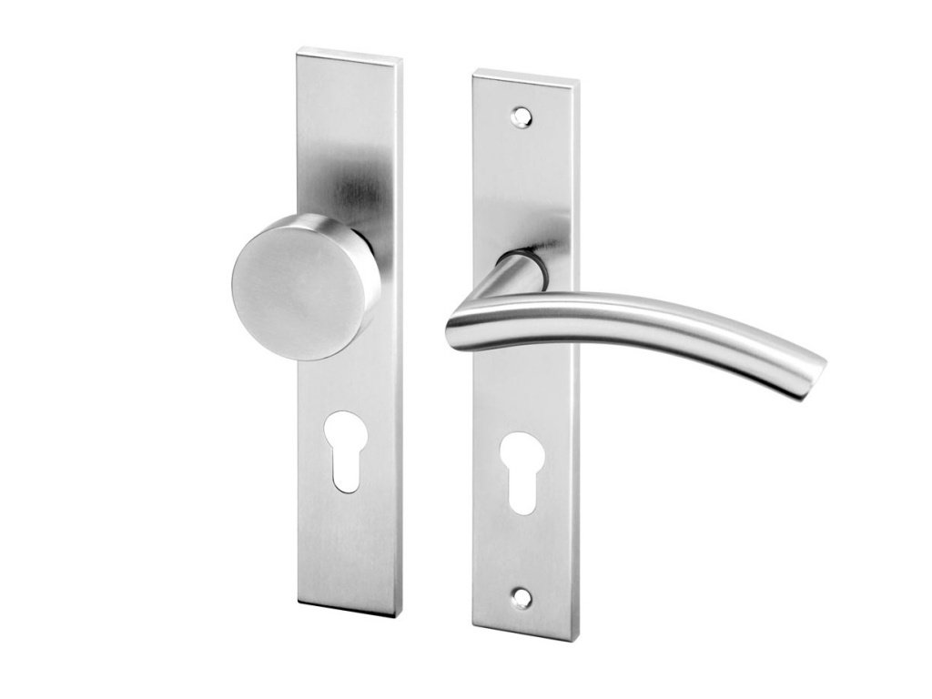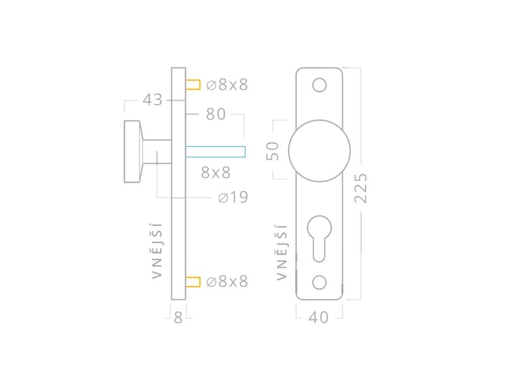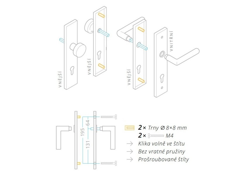 Klika je volně ve štítu bez vratné pružiny. S trny proti pootočení. Štíty jsou prošroubované skrz dveře.