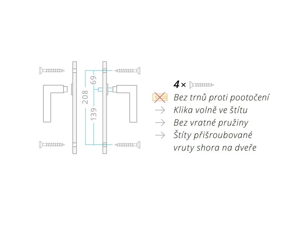 Klika je volně ve štítu bez vratné pružiny. Bez trnů proti pootočení. Štíty jsou přišroubovány vruty shora na dveře.