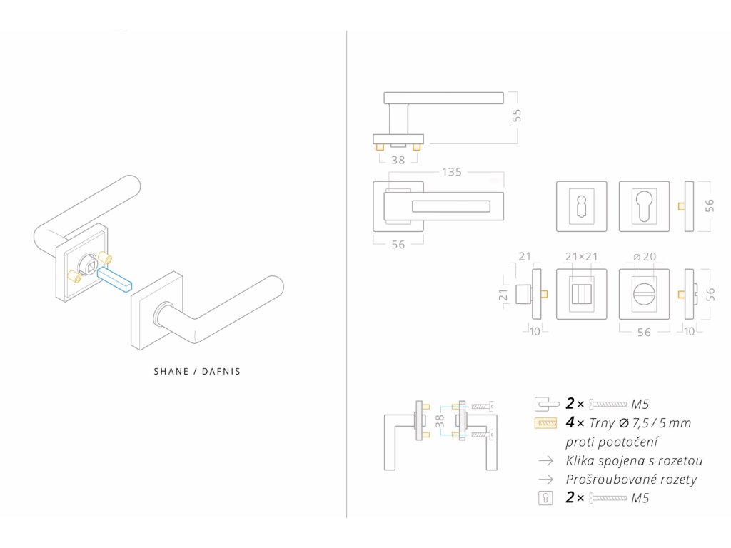 | Dveřní kliky - tvar rozety/štítu: | Hranatá rozeta |