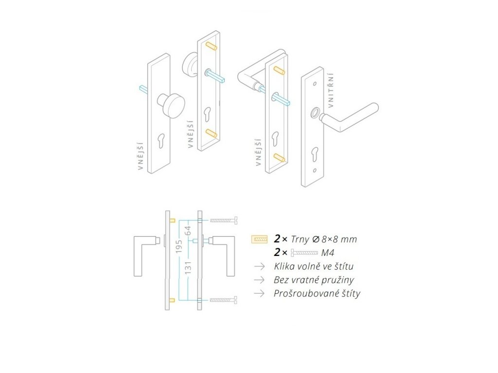 Klika je volně ve štítu bez vratné pružiny. S trny proti pootočení. Štíty jsou prošroubované skrz dveře.