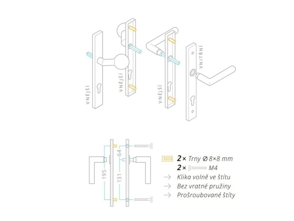 Klika je volně ve štítu bez vratné pružiny. S trny proti pootočení. Štíty jsou prošroubované skrz dveře.