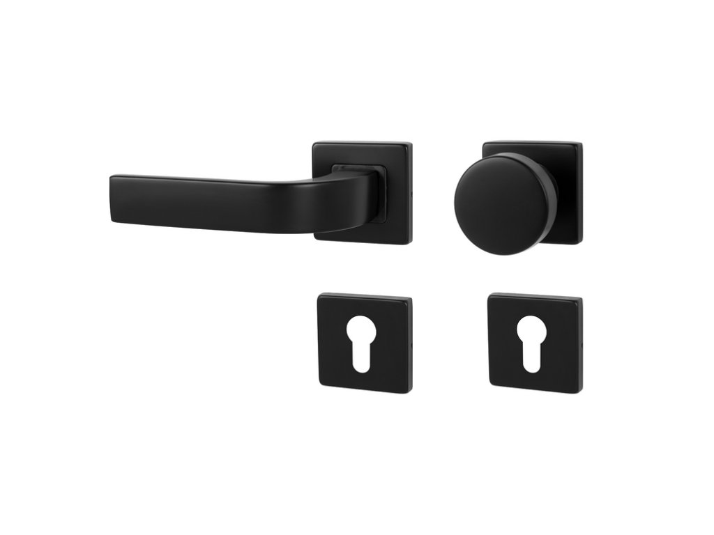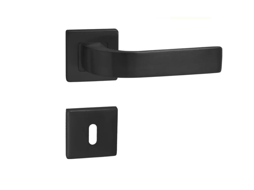 Elegantní a moderní dveřní klika s hranatou rozetou. Vyniká především svým tvarem a černou matnou povrchovou úpravou.
