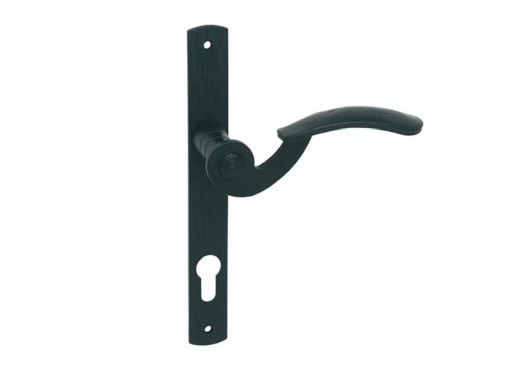 Retro štítová dveřní klika s kovaným štítem, která především vyniká svým tvarem a černou povrchovou úpravou. Je vyrobena z kovaného železa.