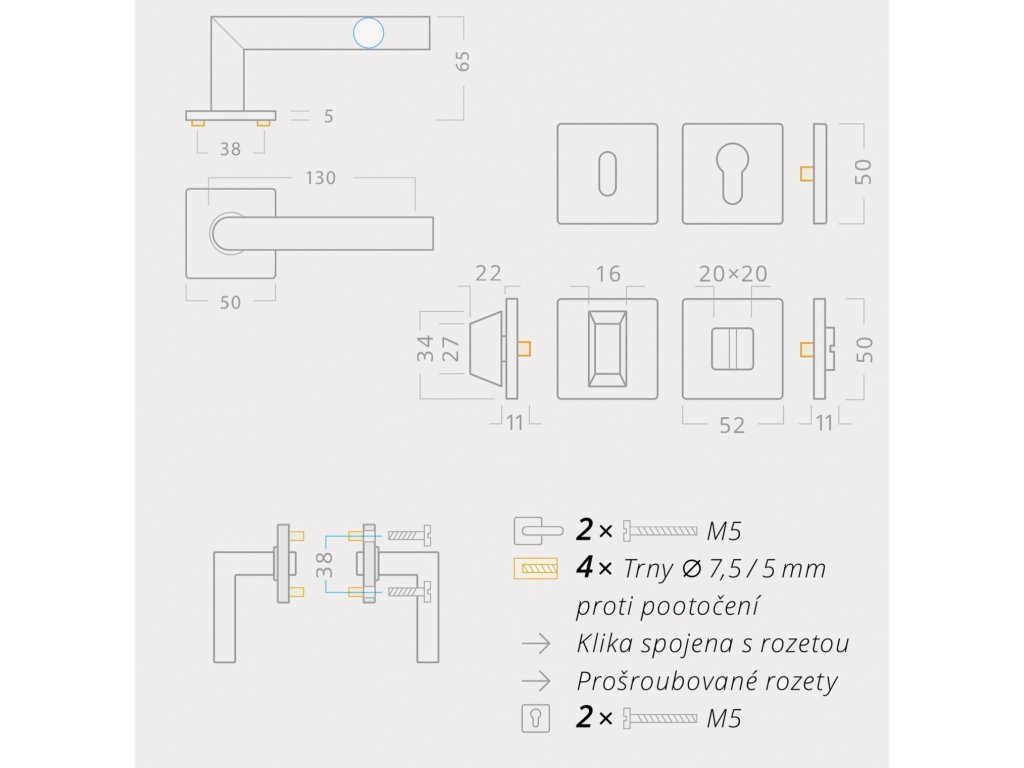 | Dveřní kliky - tvar rozety/štítu: | Hranatá rozeta |